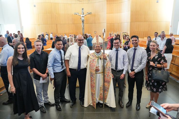 New staff from Emmaus Catholic College Kemps Creek meet Bishop Vincent Long after the 2023 Commissioning Mass.